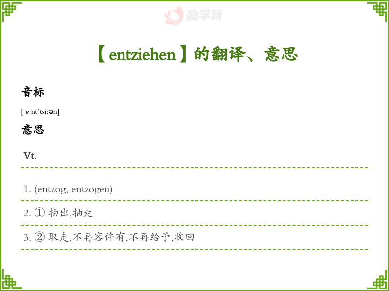 ① 避开,避(身体接触)Sie entzog sich seiner Umarmung.她避开他的拥抱。Der Fehler hat sich meiner Aufmerksamkeit entzogen. 这个错误没有被我意识到。