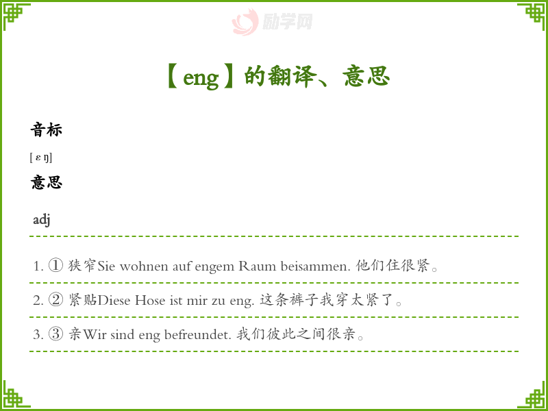 ① 狭窄Sie wohnen auf engem Raum beisammen. 他们住很紧。