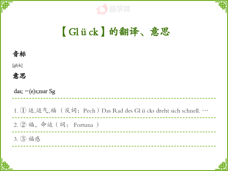 ① 运,运气,福 (反词:Pech)Das Rad des Glücks dreht sich schnell. 好景不长。Glück wie Glas, wie leicht bricht das. 福如玻璃,很容易破碎。Viel Glück im Neuen Jahr! 祝新年诸事吉利!Es war ein Glück, dass ich den Zug noch erwischt habe.总算运气,我赶上了火车。