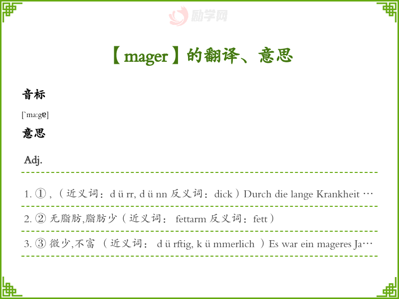 ③ 微少,不富 (近义词: dürftig, kümmerlich )Es war ein mageres Jahr für die Wirtschaft.这是经济微一年。Das Angebot an frischem Obst war früher im Winter sehr mager.以前冬天新鲜水果供应很少。