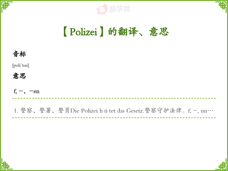 警察,警署,警员Die Polizei hütet das Gesetz.警察守护法律。f, -, unz警察,Ich muss morgen zur Polizei.明天我要到警察去。