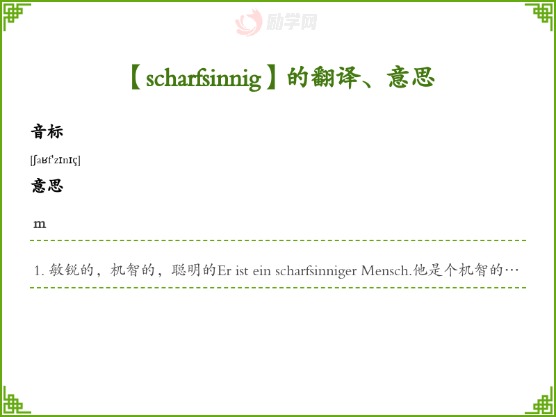 敏锐的,机智的,聪明的Er ist ein scharfsinniger Mensch.他是个机智的人。这种分析非常敏锐,揭示了潜在的问题。Diese Analyse ist sehr scharfsinnig und offenbart das zugrunde liegende Problem。她的观察力很强,能发现细微的差别。Ihre Wahrnehmung ist scharfsinnig und erkennt feine Unterschiede。