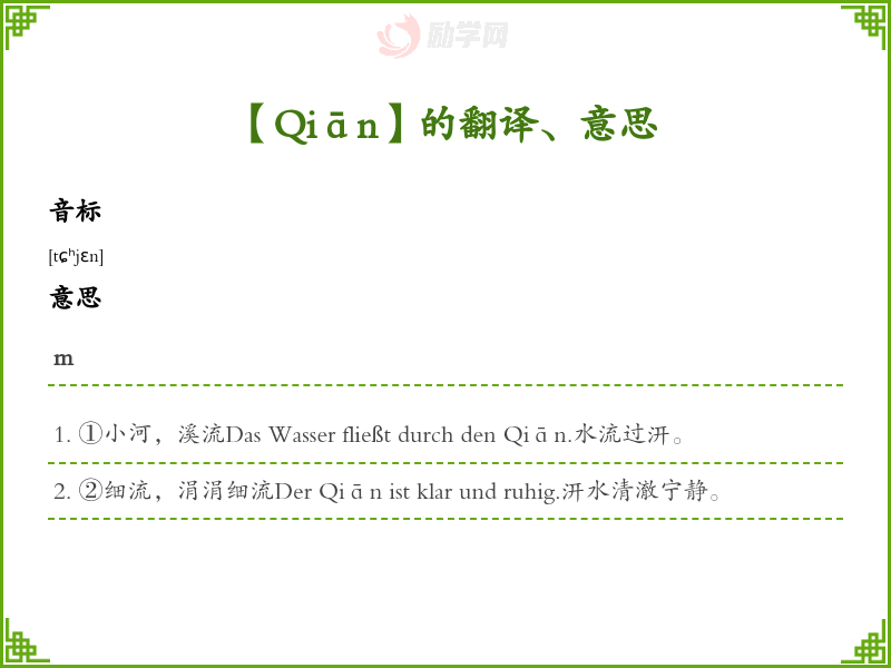 ②细流,涓涓细流Der Qiān ist klar und ruhig.汧水清澈宁静。