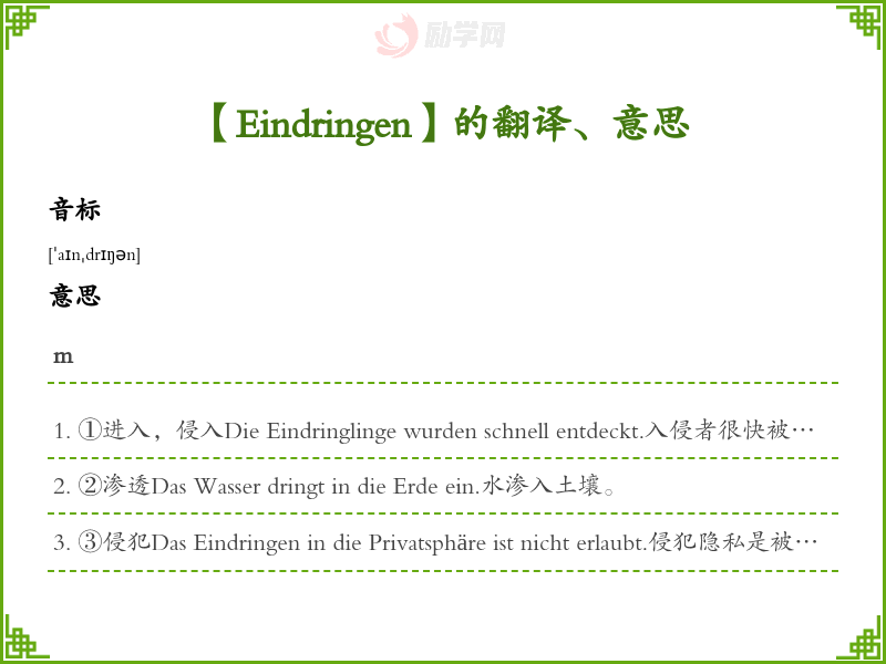 ①进入,侵入Die Eindringlinge wurden schnell entdeckt.入侵者很快被发现。
