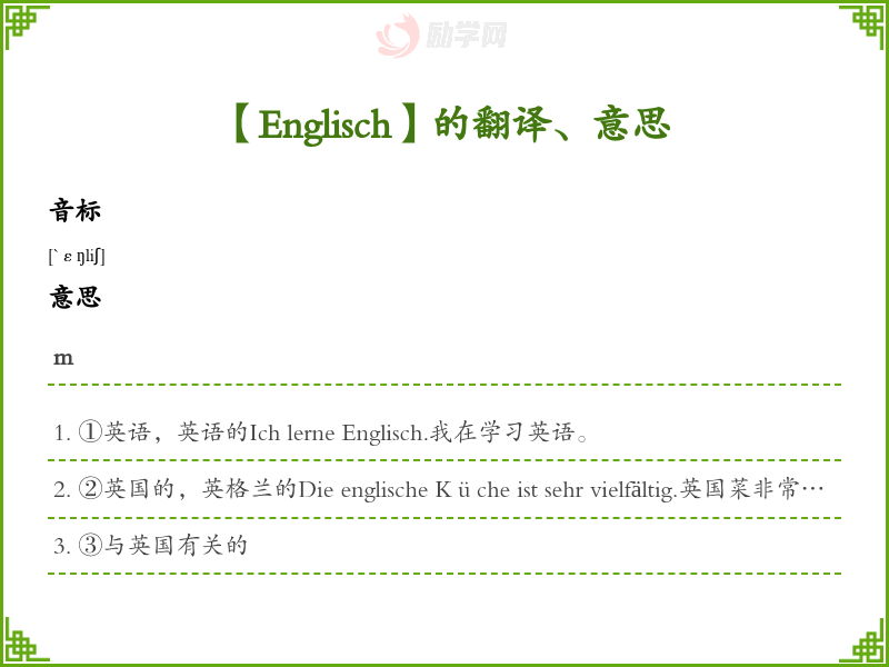 ①英语,英语的Ich lerne Englisch.我在学习英语。