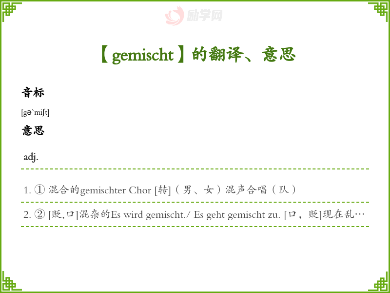 ① 混合的gemischter Chor [转](男、女)混声合唱(队)