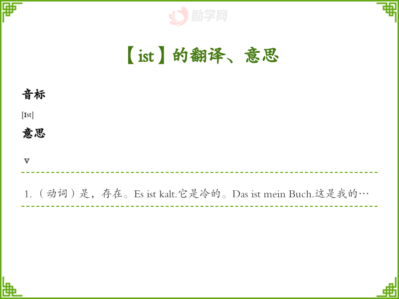 (动词)是,存在。Es ist kalt.它是冷的。Das ist mein Buch.这是我的书。