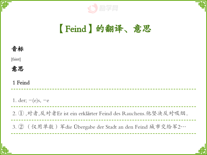 ② (仅用单数)军die Übergabe der Stadt an den Feind 城市交给军2 feindadj.[雅,旧]<只做谓语,与sein,bleiben,werden连用>对的,怀有意的;厌恶的只做谓语,与sein,bleiben,werden连用>