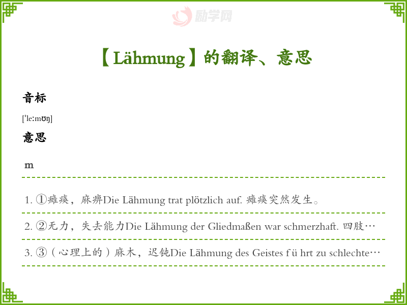 ①瘫痪,麻痹Die Lähmung trat plötzlich auf. 瘫痪突然发生。