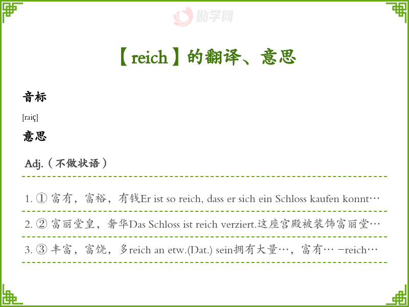 ③ 丰富,富饶,多reich an etw.(Dat.) sein拥有大量…,富有… -reich (做后缀,构成形容词)(含)…多,…丰富vitaminreich维生素丰富schneereich多雪