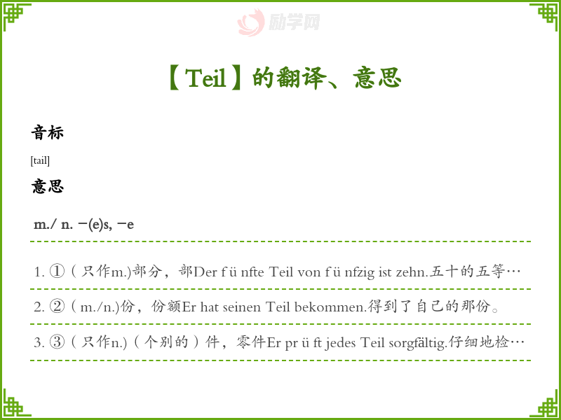 ②(m./n.)份,份额Er hat seinen Teil bekommen.得到了自己的那份。