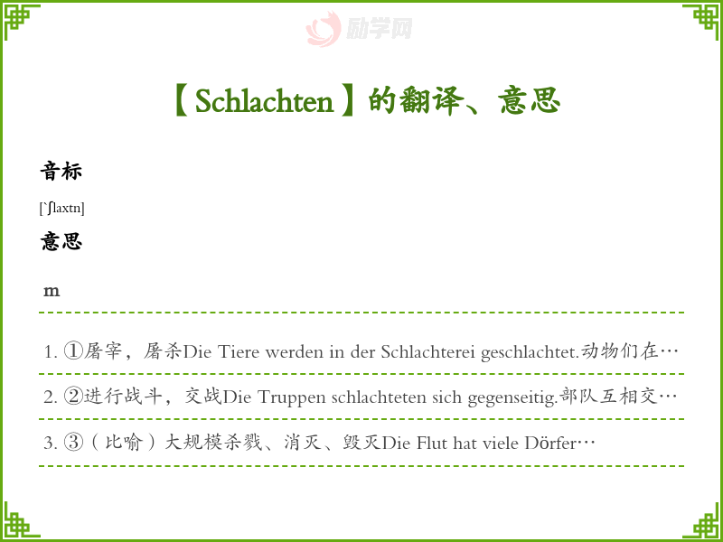 ①屠宰,屠杀Die Tiere werden in der Schlachterei geschlachtet.动物们在屠宰场被屠宰。