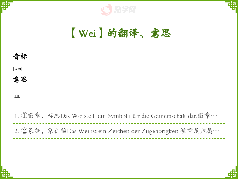 1. ①徽章,标志Das Wei stellt ein Symbol für die Gemeinschaft dar.徽章代表了社区的象征。