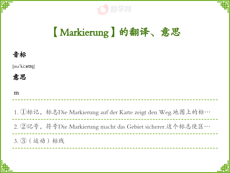 ②记号,符号Die Markierung macht das Gebiet sicherer.这个标志使区域更加安全。