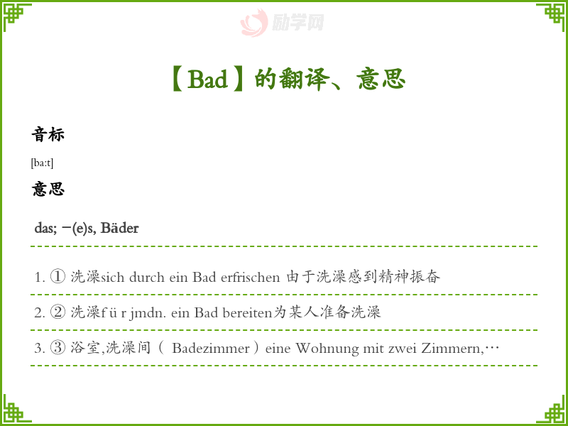 ① 洗澡sich durch ein Bad erfrischen 由于洗澡感到精神振奋