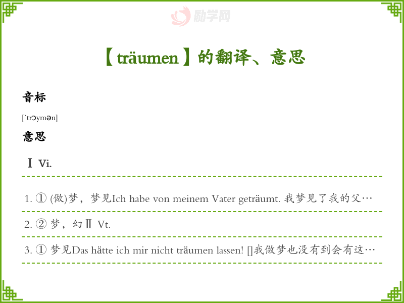 ① (做)梦,梦见Ich habe von meinem Vater geträumt. 我梦见了我的父亲。Ich habe schlecht [schön] geträumt. []我做了个恶[美]梦。Träume süß! []晚安!(祝做个甜蜜的梦!)(晚上分别时)Du träumst wohl? []是在做梦吧!(表示拒绝)