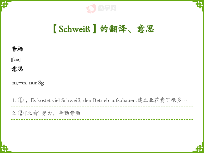 ① ,Es kostet viel Schweiß, den Betrieb aufzubauen.建立业花费了很多心血。im Schweiße seines Angesichts满头大地,流浃的