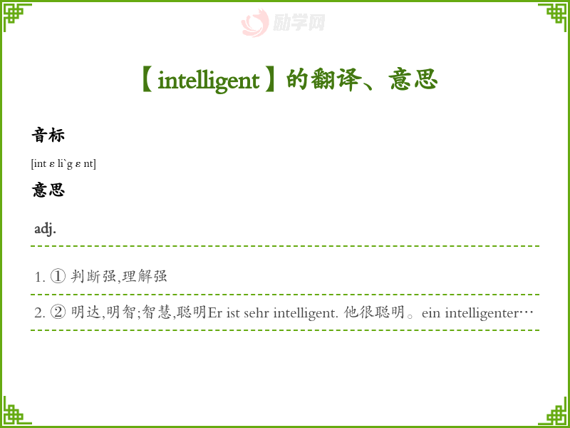 ② 明达,明智;智慧,聪明Er ist sehr intelligent. 他很聪明。ein intelligenter Mensch 一个聪明人
