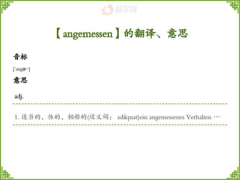 适当的,体的,相称的(近义词: adäquat)ein angemessenes Verhalten 体的行为Das Gehalt ist der Leistung angemessen.工资所劳动付出是相称的。