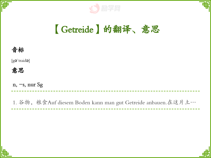谷物,粮食Auf diesem Boden kann man gut Getreide anbauen.在这片土地上人们可以种植良好粮食。Jedes Jahr wird weltweit mehr Getreide produziert.每年世内都会生产出很粮食。