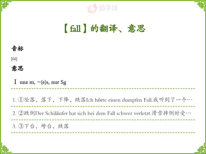 ①坠落,落下,下降,跌落Ich hörte einen dumpfen Fall.我听到了一个沉重的坠落声。