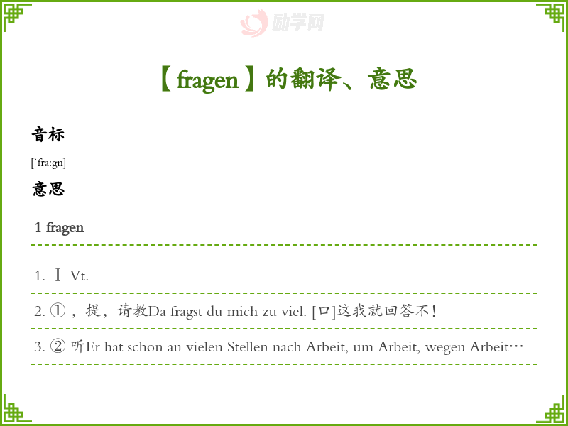 ② 听Er hat schon an vielen Stellen nach Arbeit, um Arbeit, wegen Arbeit gefragt. 他许多部门找工作。Ⅱ Vi.及,关心Der Vater fragte nicht nach den Kindern. 爸爸不关心他的孩子们。Ⅲ Vr.思考,自Ich frage mich, ob ich das tun kann. 我自我是否能这么做。Es fragt sich nur, ob ich kommen kann. 我能不能来还是题。2 Fragef; -, -n