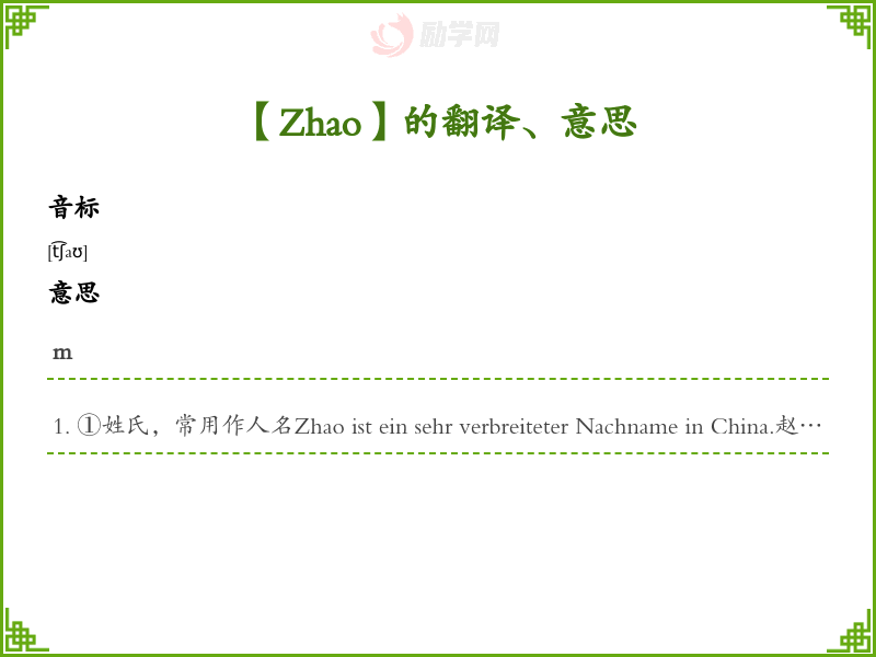 ①姓氏,常用作人名Zhao ist ein sehr verbreiteter Nachname in China.赵是中国一个非常常见的姓氏。
