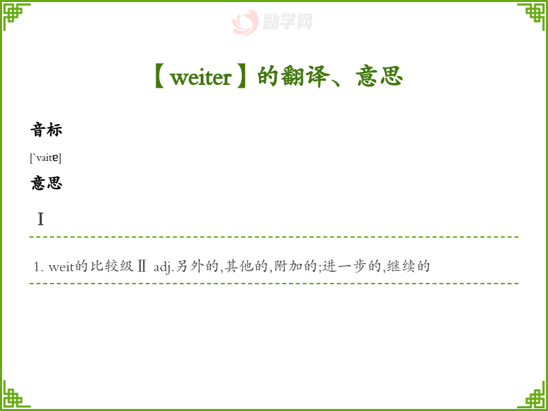weit的比较级Ⅱ adj.另外的,其他的,附加的;进一步的,继续的