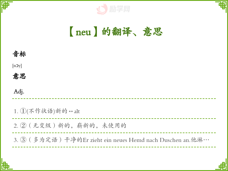 ⑧(只做状语)新neu schreiben写von Neuem/neuem=wieder, noch einmalEr hat es noch nie geschafft, aber er versucht es jeden Tag von Neuem.他从未成,他天新尝试。