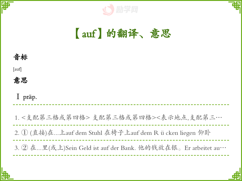 ④ <用于固定搭配> 用于固定搭配>Auf bald! 回头!Auf Wiedersehen!!auf immer 远<表示方式方法、程度,支配第四格> 表示方式方法、程度,支配第四格>Sie hat mich auf den ersten Blick erkannt. 她一眼就认出我来了。auf diese Weise 用这种方式auf einmal 突然,一下子etw.(A) auf deutsch sagen 用德语讲某事<表示目的、愿望,支配第四格>表示目的、愿望,支配第四格>Auf Ihre Gesundheit trinken! 为您的健康干杯!<表示原因、条件,支配第四格>表示原因、条件,支配第四格>根据,凭,靠auf seine Bitte [hin] 照他的请求Er ist auf meine Bitte [hin] zum Arzt gegangen. 他照我的请求找医生看病去了。Das geschah auf seinen Vorschlag. 这是根据他的命令做的。<表示数量与基本单位的关系,支配第四格>表示数量与基本单位的关系,支配第四格>每Auf jeden (ent)fallen 100 Mark. 每个人分到一百马克。<与bis 连用="">与bis>