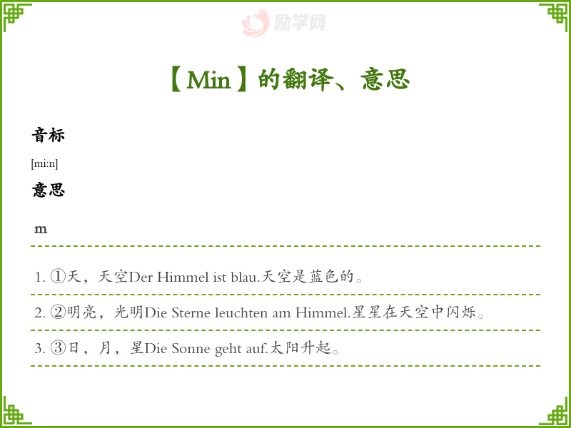 ①天,天空Der Himmel ist blau.天空是蓝色的。