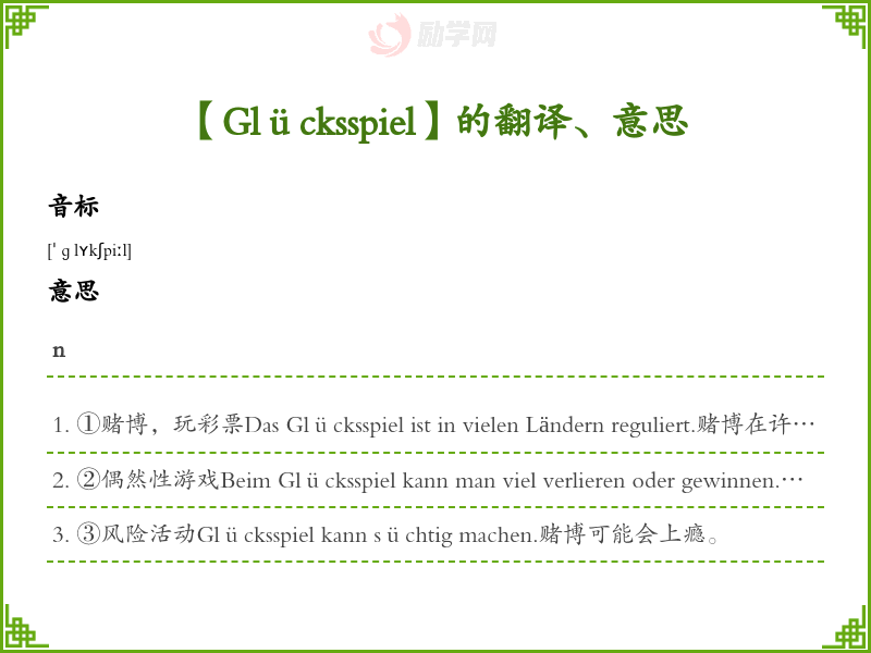 ①赌博,玩彩票Das Glücksspiel ist in vielen Ländern reguliert.赌博在许多国家受到监管。