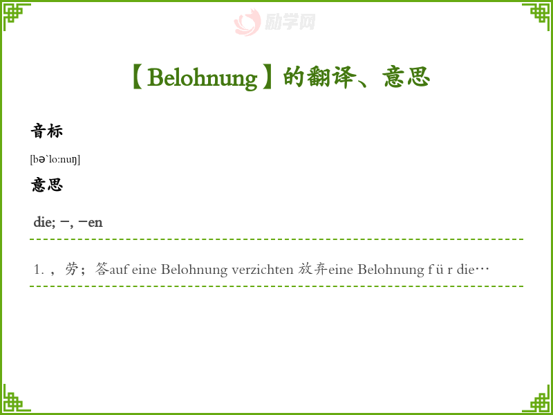 ,劳;答auf eine Belohnung verzichten 放弃eine Belohnung für die Aufklärung eines Verbrechens aussetzen悬赏查明罪行als Belohnung (或 zur Belohnung) für etw. 作为对某事的