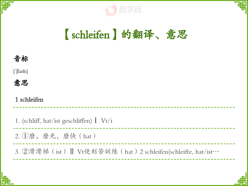 ②滑滑梯(ist)Ⅱ Vt使刻苦训练(hat)2 schleifen(schleifte, hat/ist geschleift)Ⅰ Vt(hat)