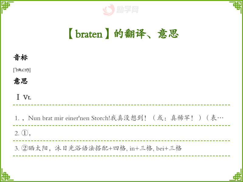 ,Nun brat mir einer'nen Storch!我真没想到!(或:真稀罕!)(表示惊讶或愤)Ⅱ Vi.