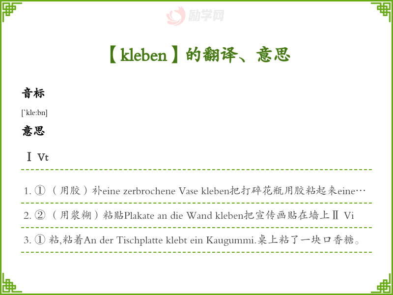 ② 有粘性Die Briefmarke klebt nicht mehr.邮票不粘了。Dieser Leim klebt hervorragend.这种胶黏性好。