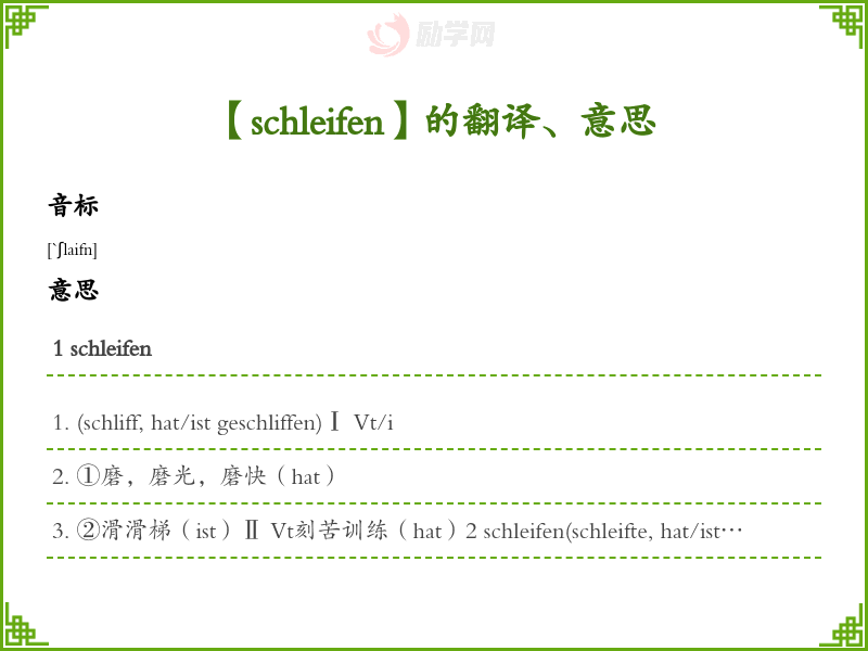 ②滑滑梯(ist)Ⅱ Vt刻苦训练(hat)2 schleifen(schleifte, hat/ist geschleift)Ⅰ Vt(hat)