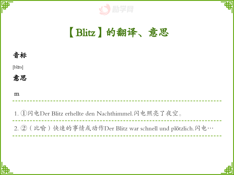 ②(比喻)快速的事情或动作Der Blitz war schnell und plötzlich.闪电来得快而突然。