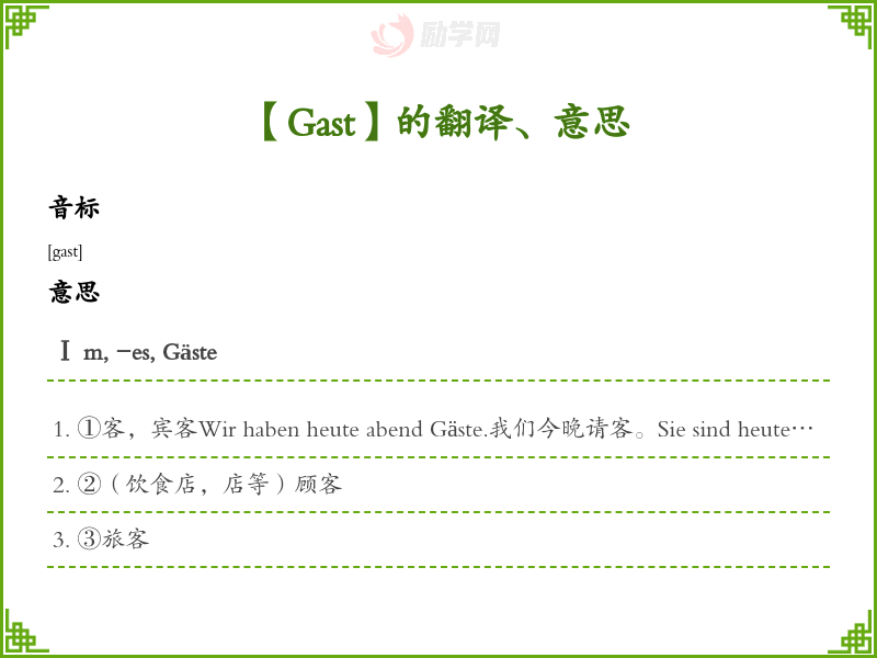 ①客,宾客Wir haben heute abend Gäste.我们今晚请客。Sie sind heute mein Gast.今天我请您客。
