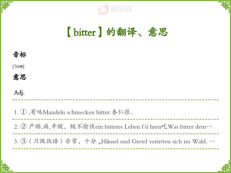 ② 严酷,痛,辛酸,极不愉快ein bitteres Leben führen吃Was bitter dem Mund, ist dem Magen gesund.良。