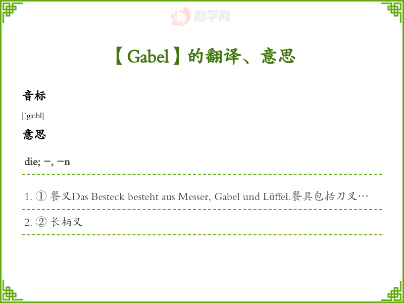 ① 餐叉Das Besteck besteht aus Messer, Gabel und Löffel.餐具包括刀叉勺。