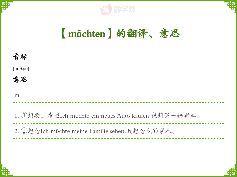 ①想要,希望Ich möchte ein neues Auto kaufen.我想买一辆新车。
