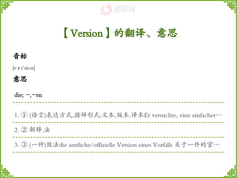 ① (语言)表达方式,措辞形式;文本,版本,译本Er versuchte, eine einfachere Version desselben Vorschlages zu finden. 他想对同一个建议寻找一种较为简单的表达方式。Er hat eine deutsche Version des Drehbuches angefertigt. 他完成了电影剧本的德语译本。