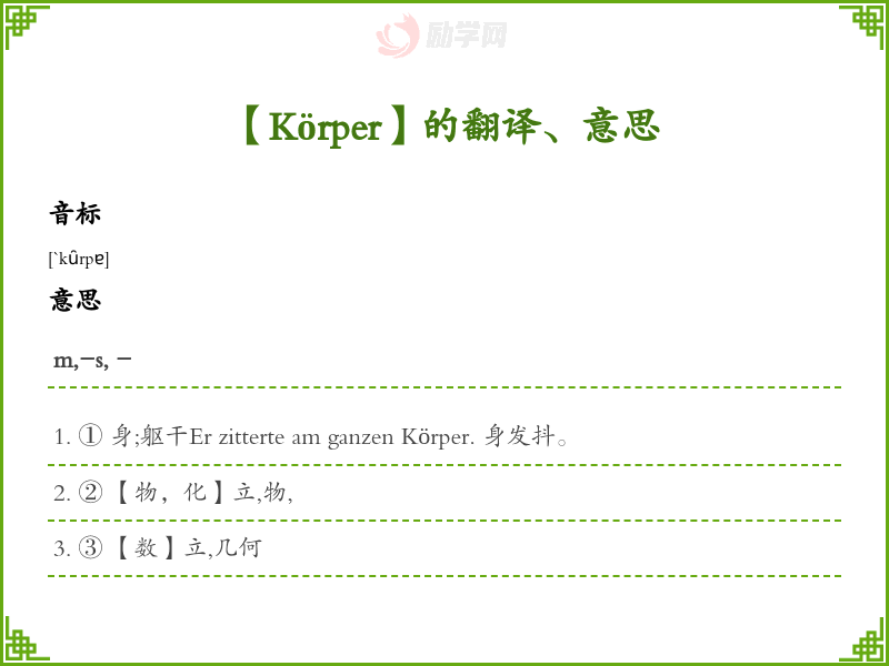 ⑤ <专业用词>浓度,密度专业用词>Der Wein hat Körper. 这葡萄酒味道浓。