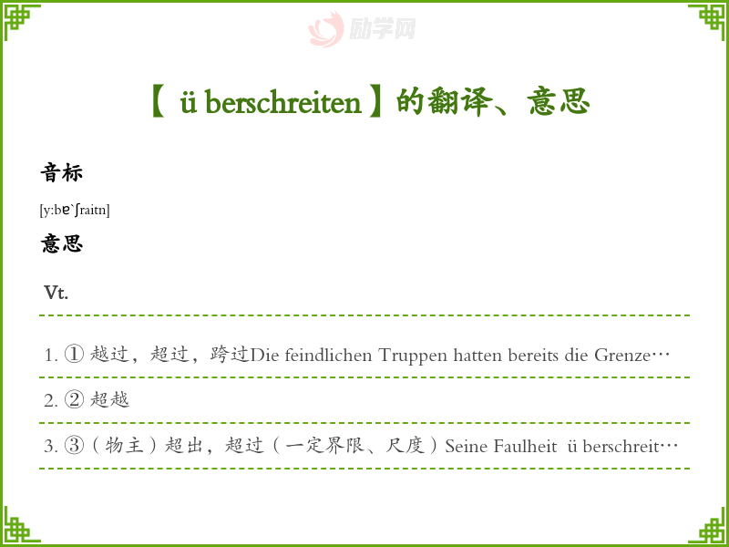 ③(物主)超出,超过(一定界限、尺度)Seine Faulheit überschreitet das erträgliche Maß.他的懒惰超出了可以容忍的程度。