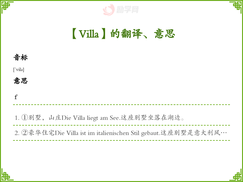 ①别墅,山庄Die Villa liegt am See.这座别墅坐落在湖边。