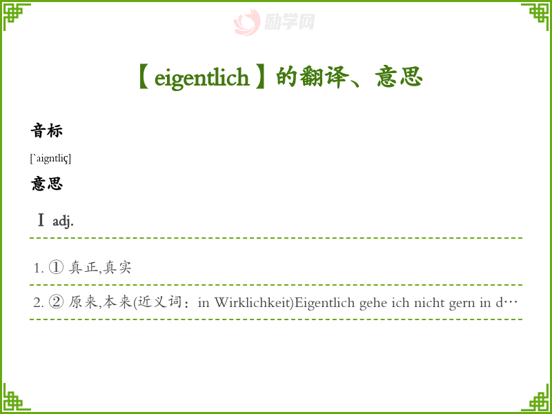 ② 原来,本来(近义词:in Wirklichkeit)Eigentlich gehe ich nicht gern in die Disko.我其实原本想去舞厅。Ⅱ adv.其实,究竟,到底,本来Er heißt eigentlich Meyer.他其实叫Meyer.