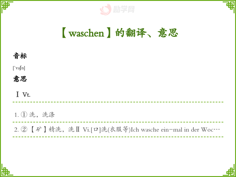 ② 【矿】精洗,洗Ⅱ Vi.[口]洗(衣服等)Ich wasche ein-mal in der Woche. 我每星期洗一次衣服。Ⅲ Vi(s.)【海】,没Die Wogen waschen über das Deck. 大浪甲板。Ⅳ Vr.洗,洗涤Ich wasche mich morgens und abends. 我早晚洗脸(或洗澡)。语法搭配+四格, sich+三格, sich+四格