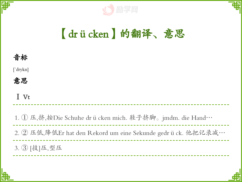 ③ 逃避sich vor/von der Arbeit drücken 逃避工作sich um die Arbeit drücken 逃避工作Ⅳdrückend P.Ⅰeine drückende Hitze 令人窒息酷热Diese Mannschaft war drückend überlegen. 【体】这个队占压倒性优势。Ⅴgedrückt P.Ⅱ气馁,沮丧,充满忧虑Gedrückte Stimmung 郁闷心情语法搭配sich+四格, +四格, +三格, mit+三格, in+四格, zu+三格, auf+四格, um+四格, gegen+四格, an+三格, an+四格, aus+三格, vor+三格