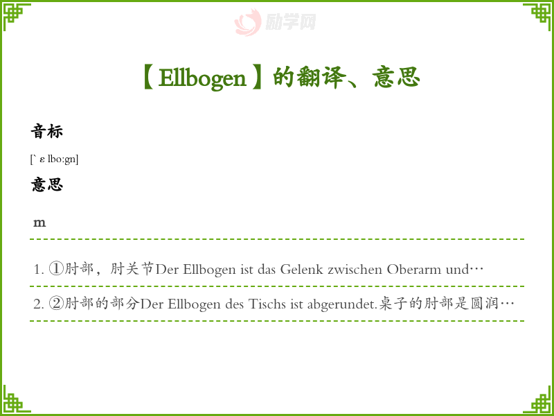 ①肘部,肘关节Der Ellbogen ist das Gelenk zwischen Oberarm und Unterarm.肘关节是上臂和前臂之间的关节。